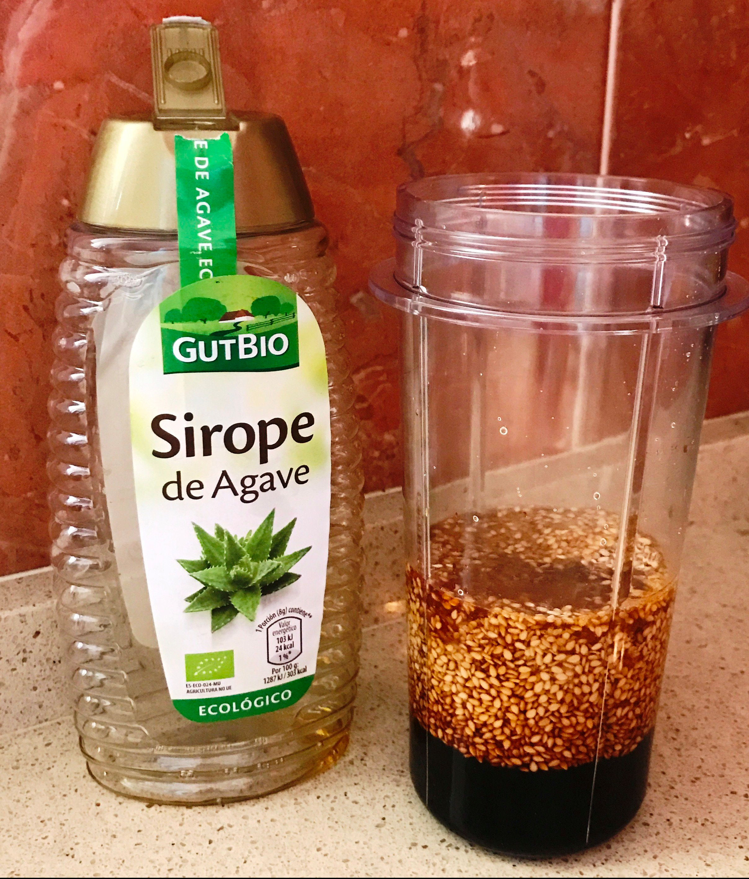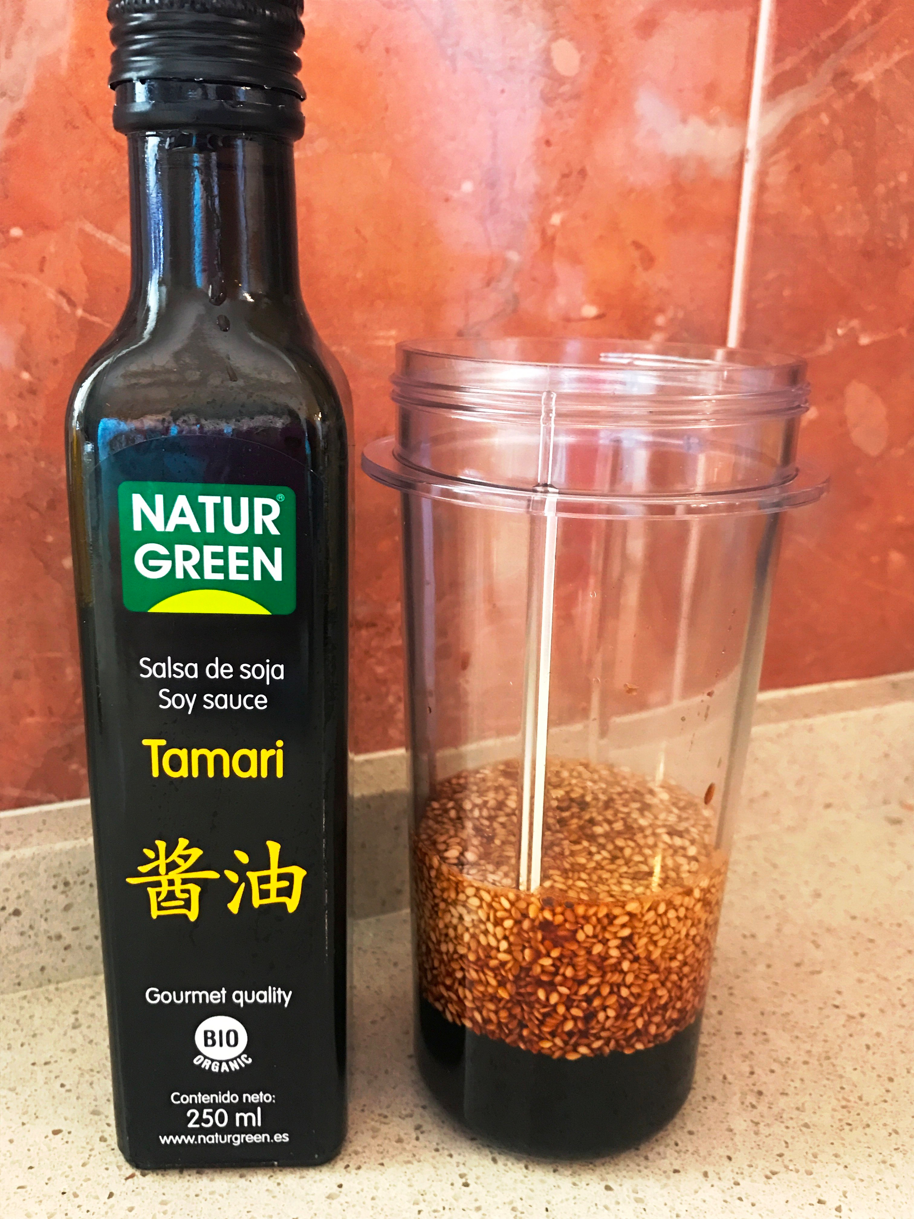 4 cucharadas soperas de sésamo tostado, zumo de 1/2 limón, 8 cucharadas soperas de tamari y 2 cucharadas soperas de néctar de agave.