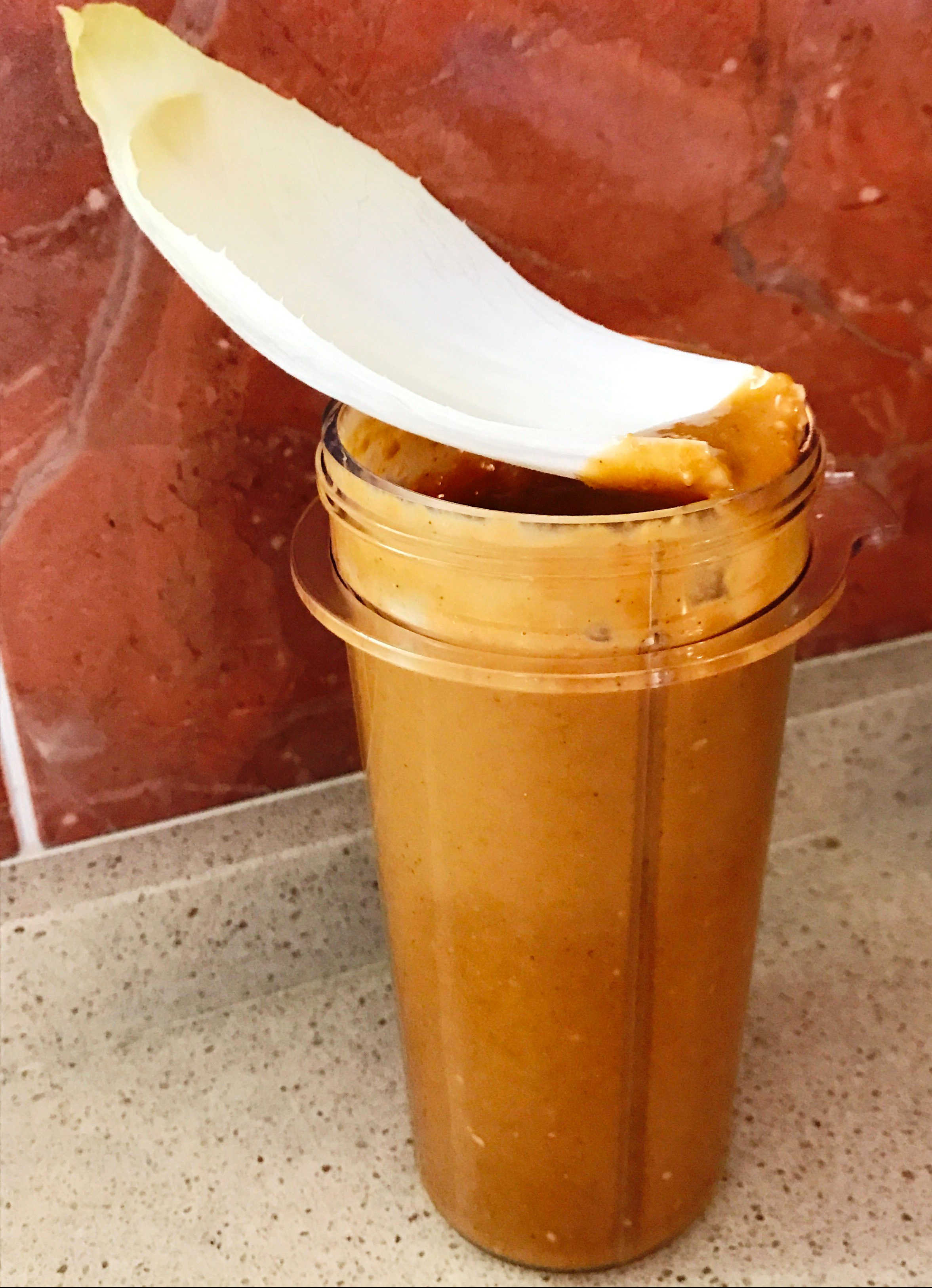 Añadir 300 ml de aceite de oliva y mezclar bien, quizás -dependiendo de la batidora- agitando de vez en cuando y sin dejar de mezclar. Se convierte en una salsa muy sabrosa y suave. Ideal como salsa o diluido con agua para hacer un aliño para ensaladas.