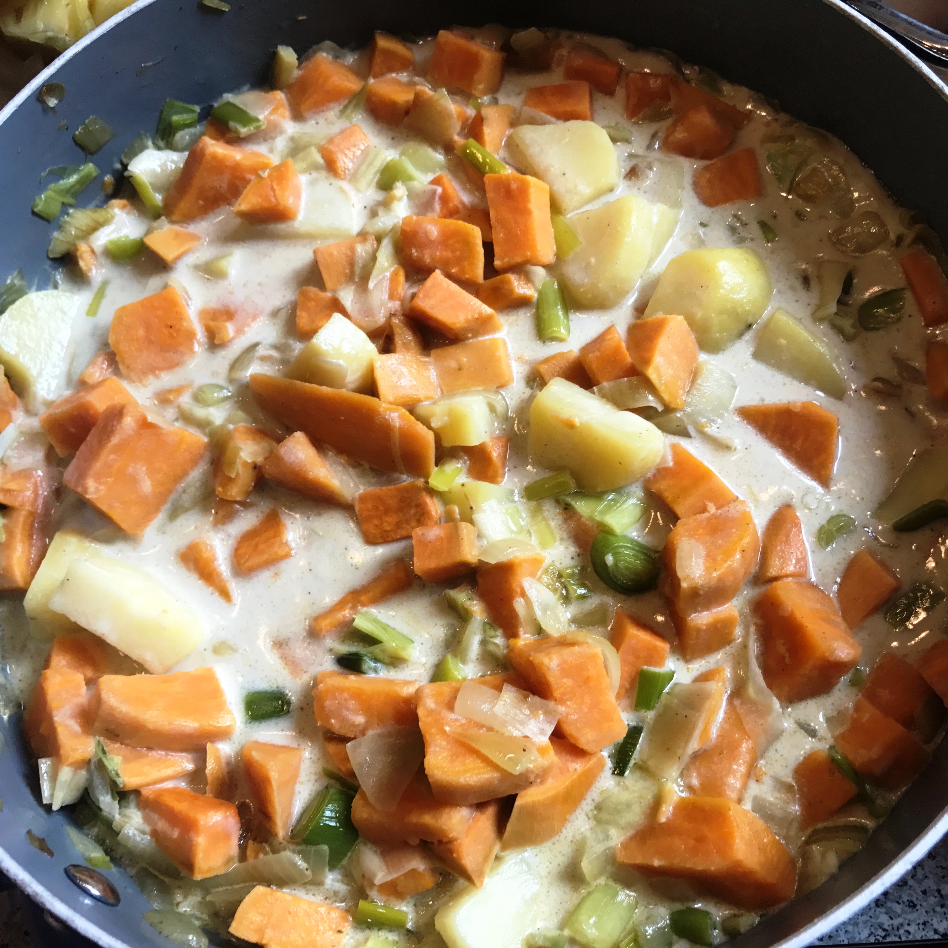 Sartén tailandesa de verduras con cebolla, puerro, jengibre, hojas de limón, boniatos, patatas y leche de coco.