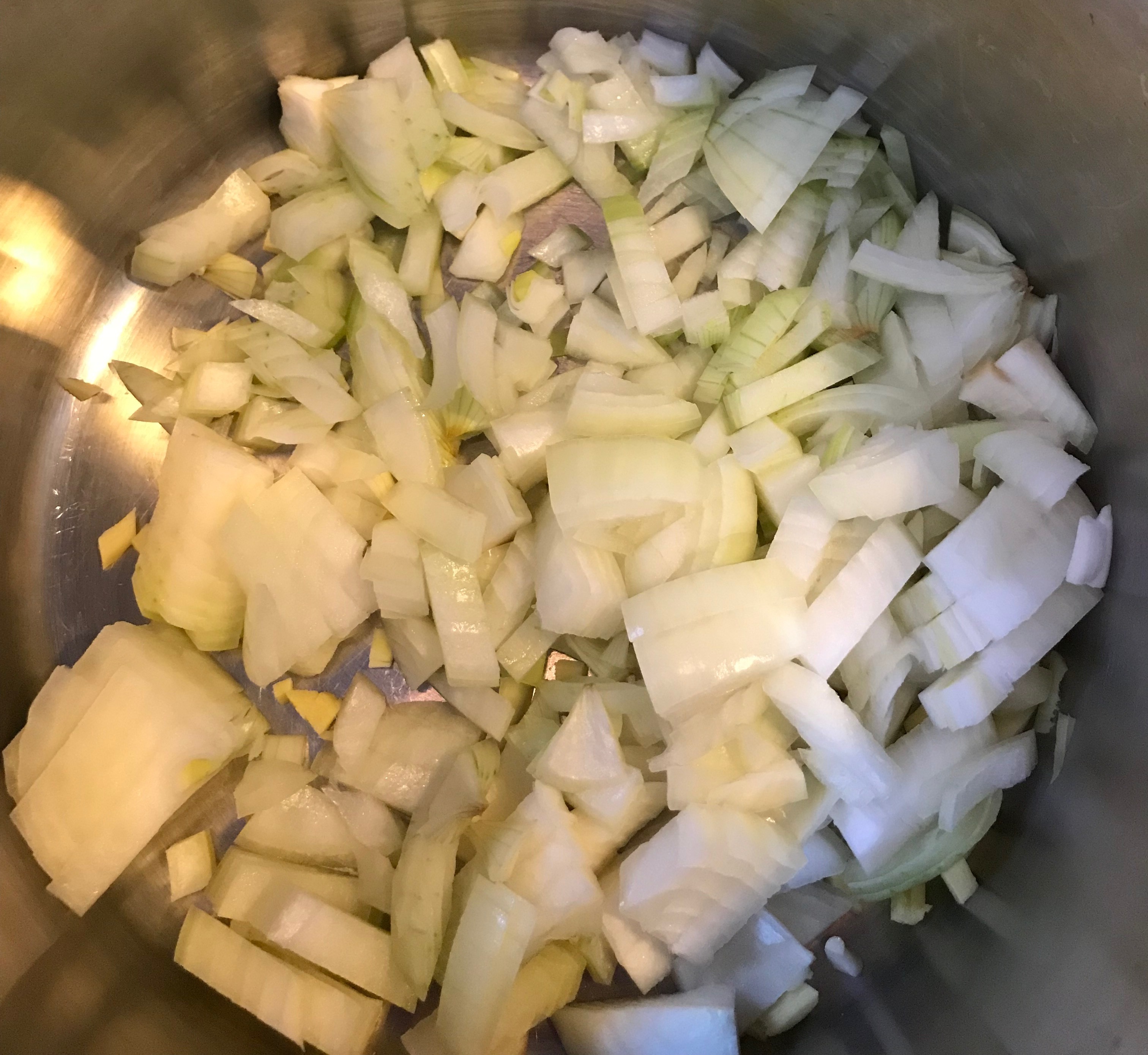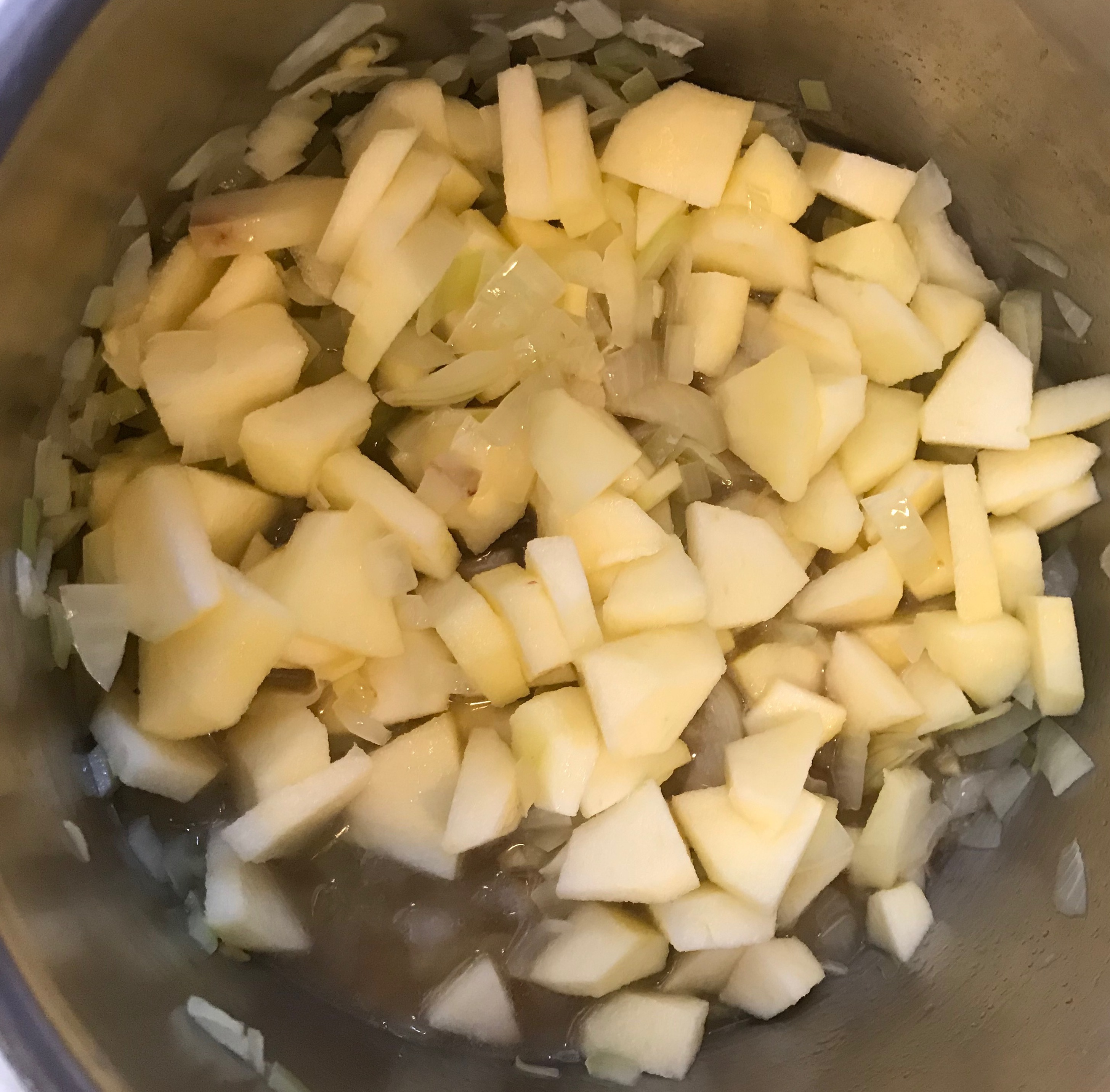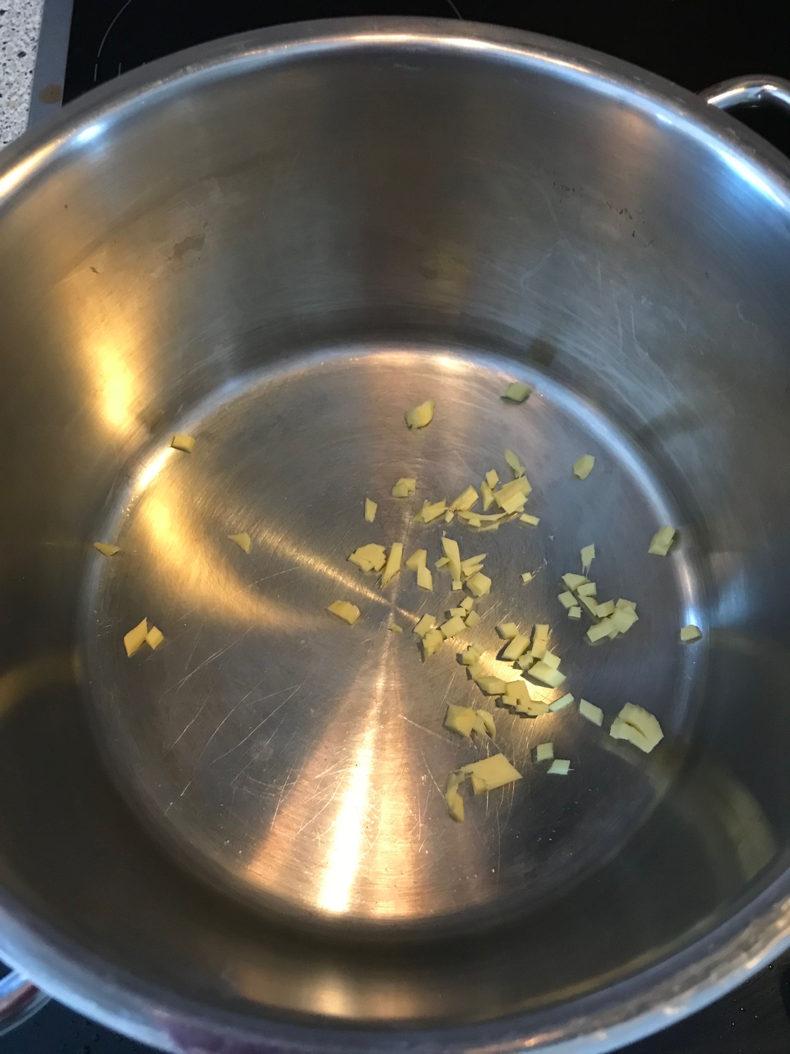 In einem Topf ein Stück gewürfelten Ingwer in etwas Brat-Öl, zusammen mit 1-2 gewürfelten Zwiebeln und etwas Salz glasig werden lassen. 2 Äpfel schälen und würfeln.
