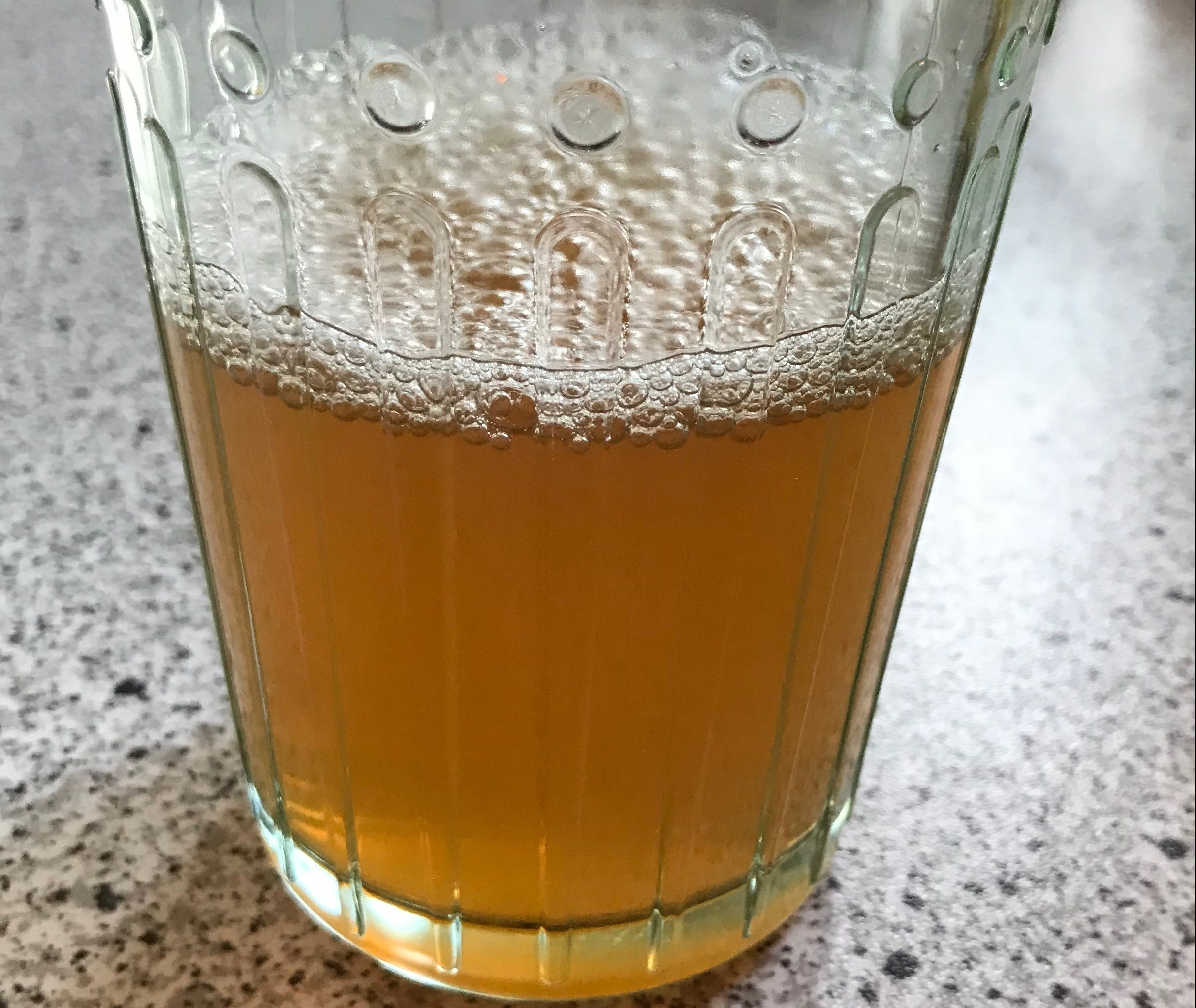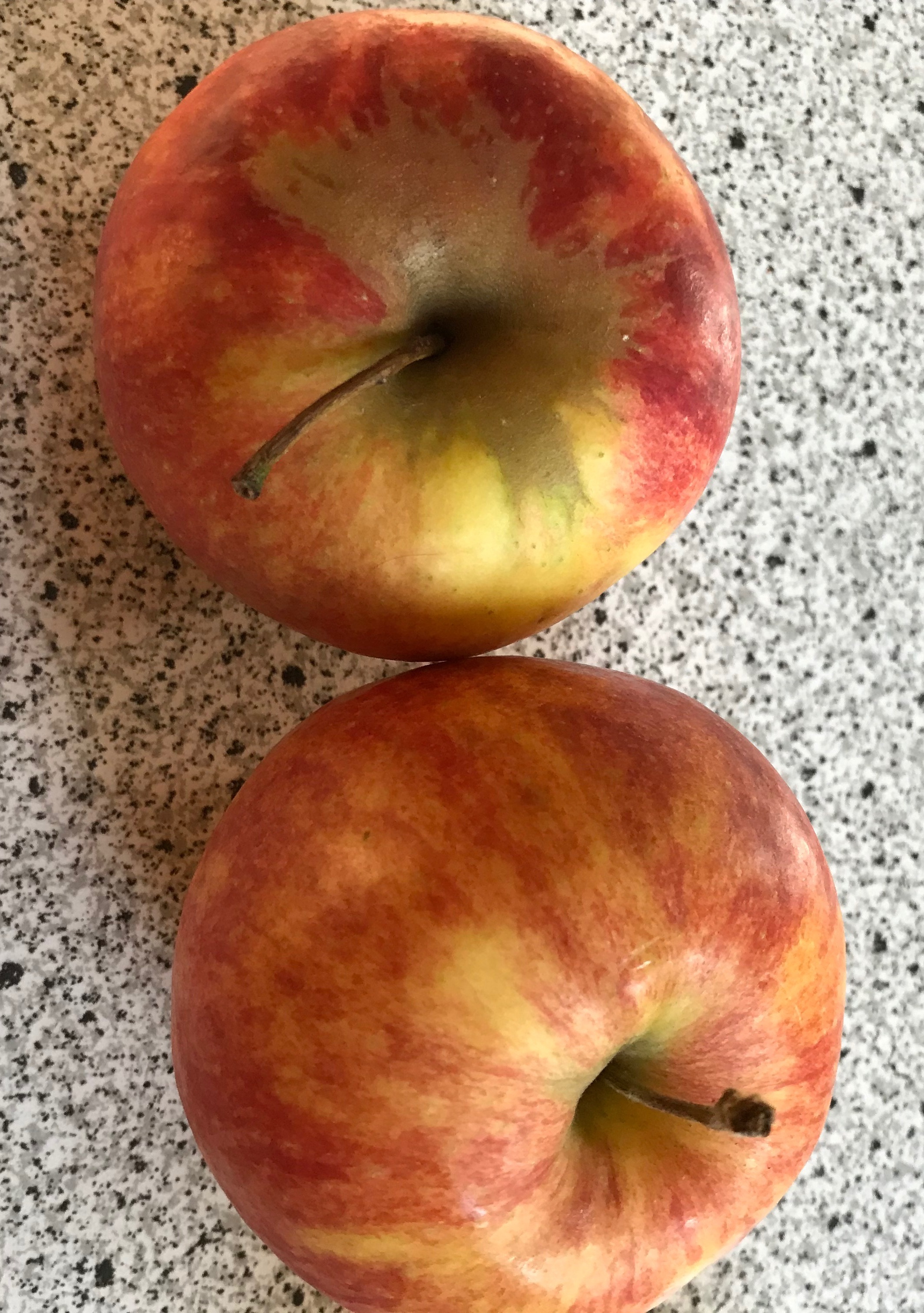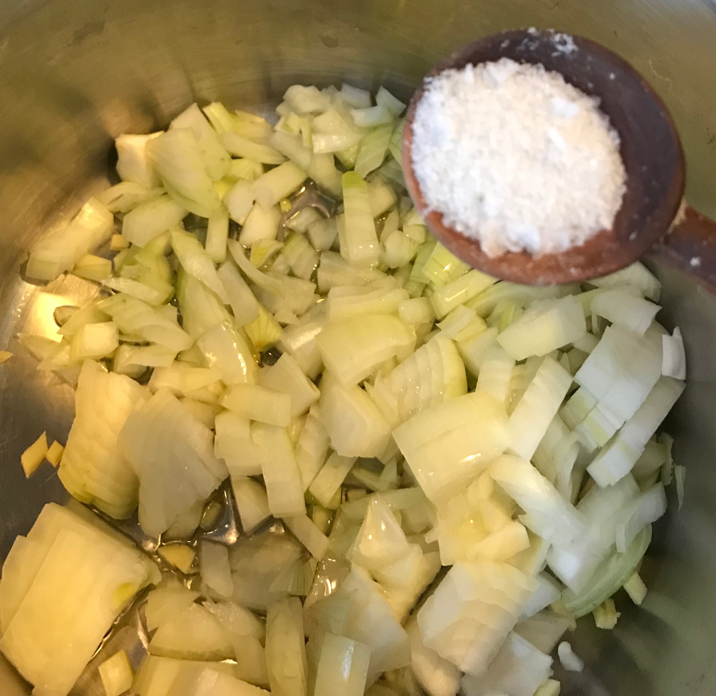 In einem Topf ein Stück gewürfelten Ingwer in etwas Brat-Öl, zusammen mit 1-2 gewürfelten Zwiebeln und etwas Salz glasig werden lassen. 2 Äpfel schälen und würfeln.
