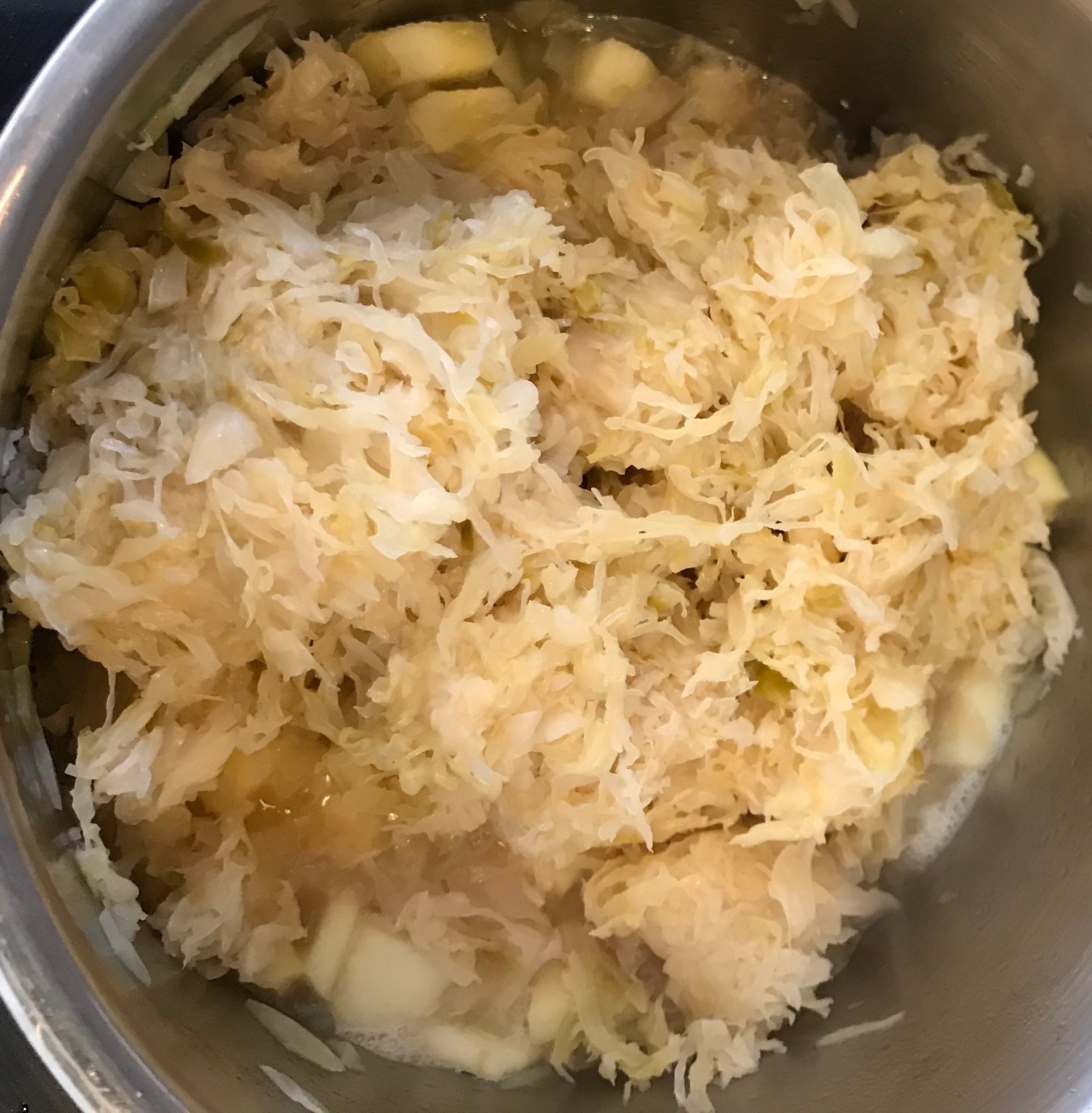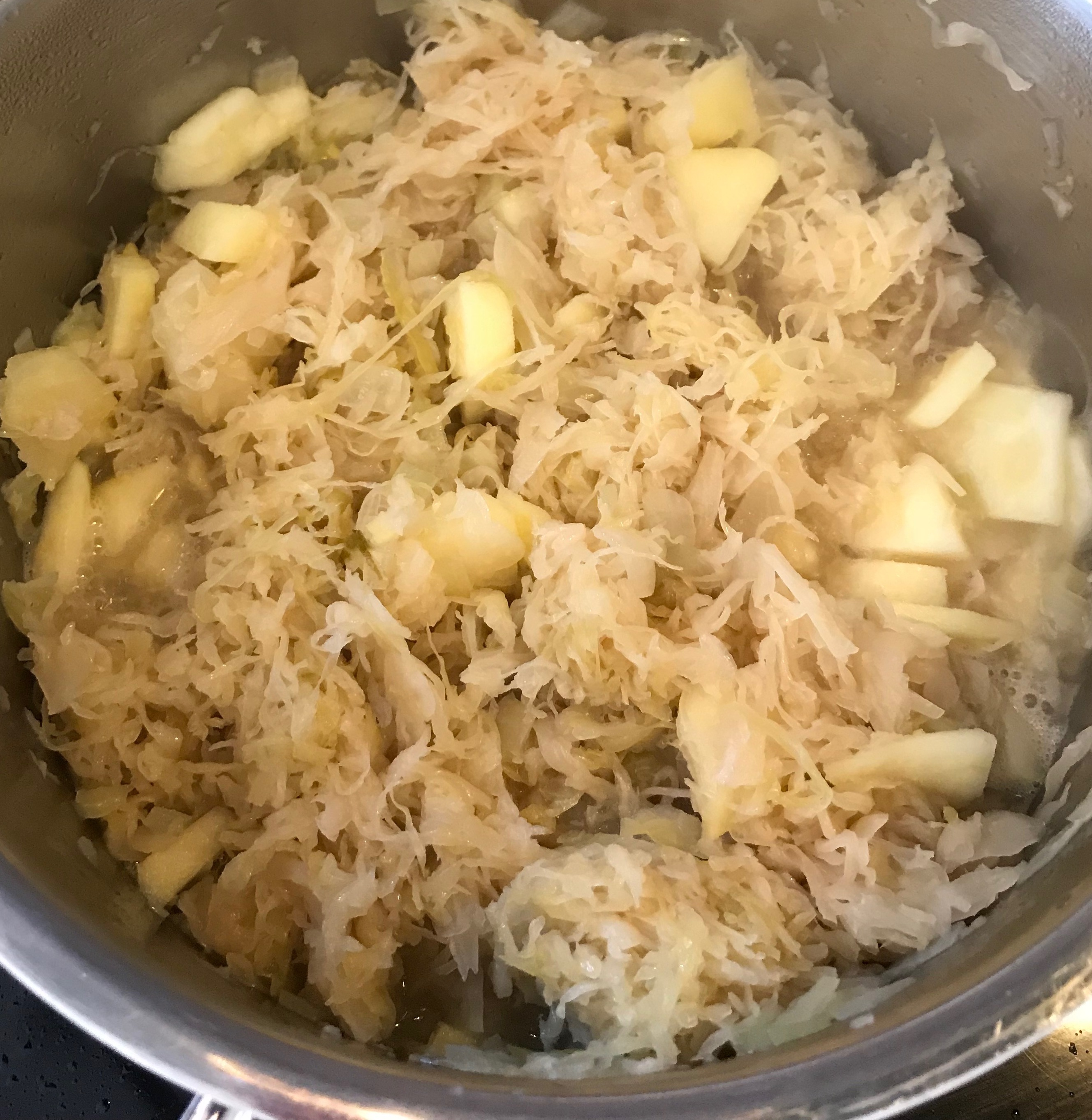 Die Apfelstücke zu den glasigen Zwiebeln geben, unterrühren. Sauerkraut und etwas Apfelsaft dazu geben. Auf mittlerer Flamme 10 Minuten köcheln lassen, bis die Äpfel weich sind. Schmeckt sehr lecker, wärmt schön.