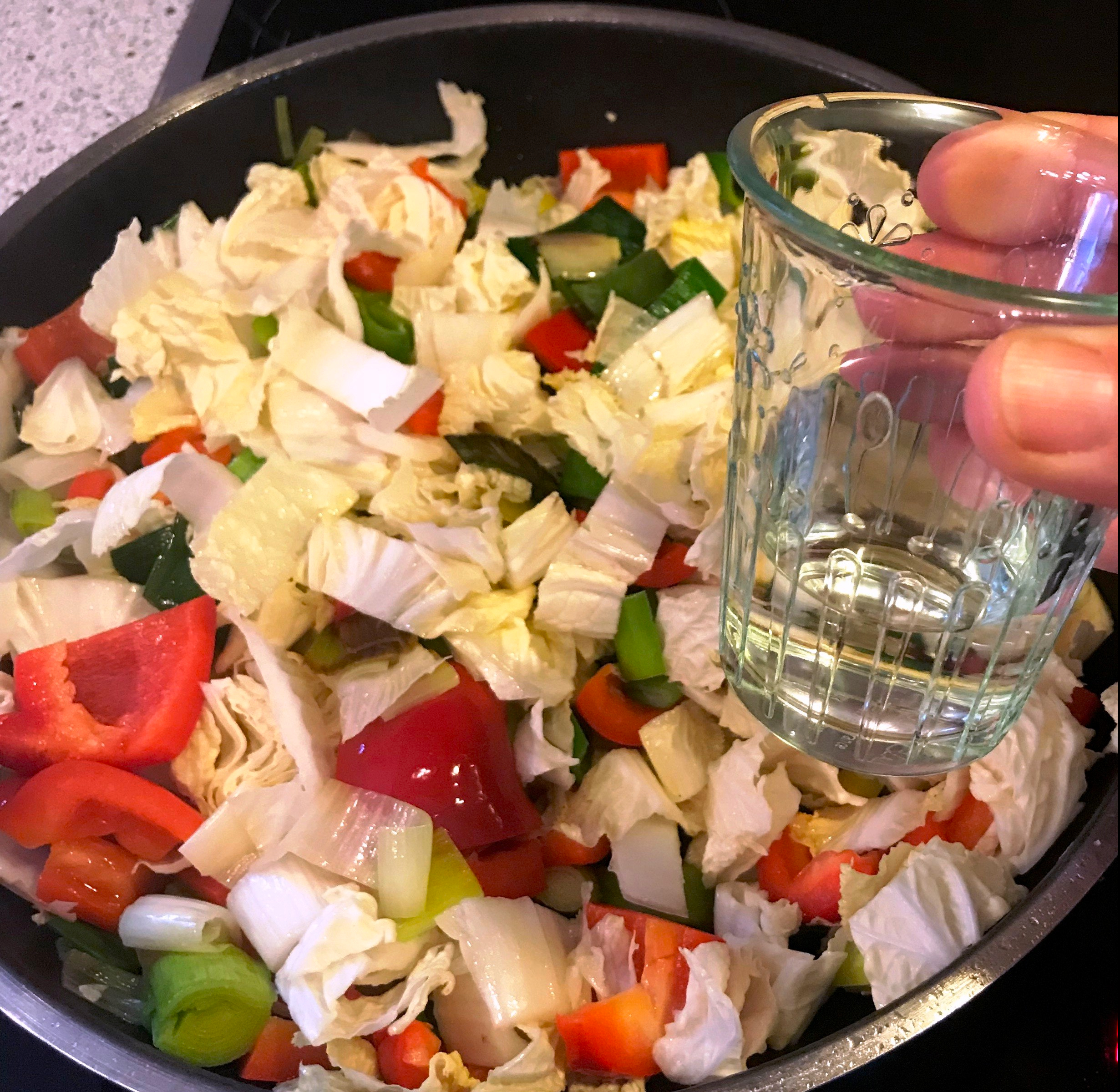 Chinakohl und eine Prise Salz dazu geben, weitere 2 Minuten anbraten. 1 Schluck Wasser dazu geben, die Pfanne bedecken und noch bei mittlerer Flamme 3 Minuten ziehen lassen.
