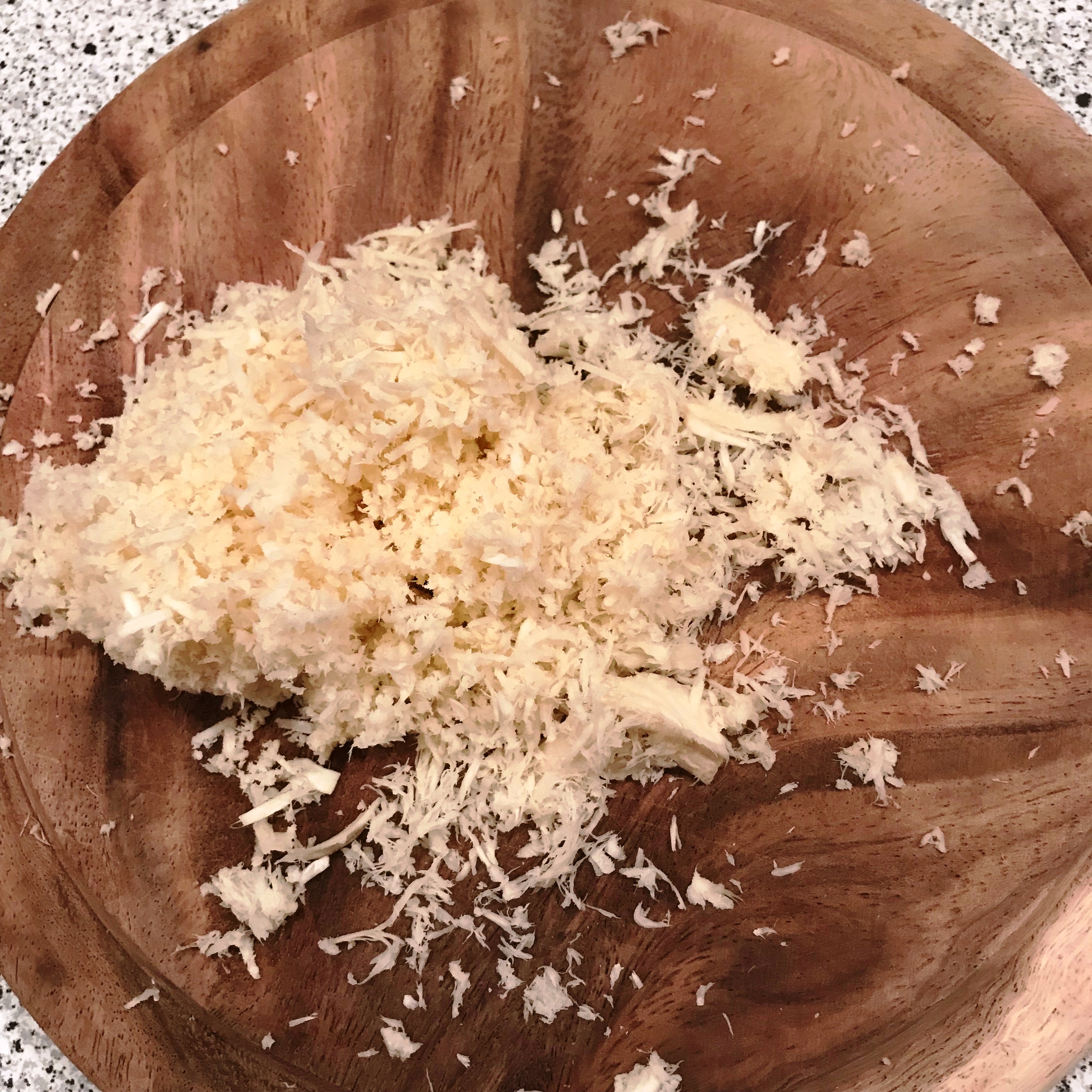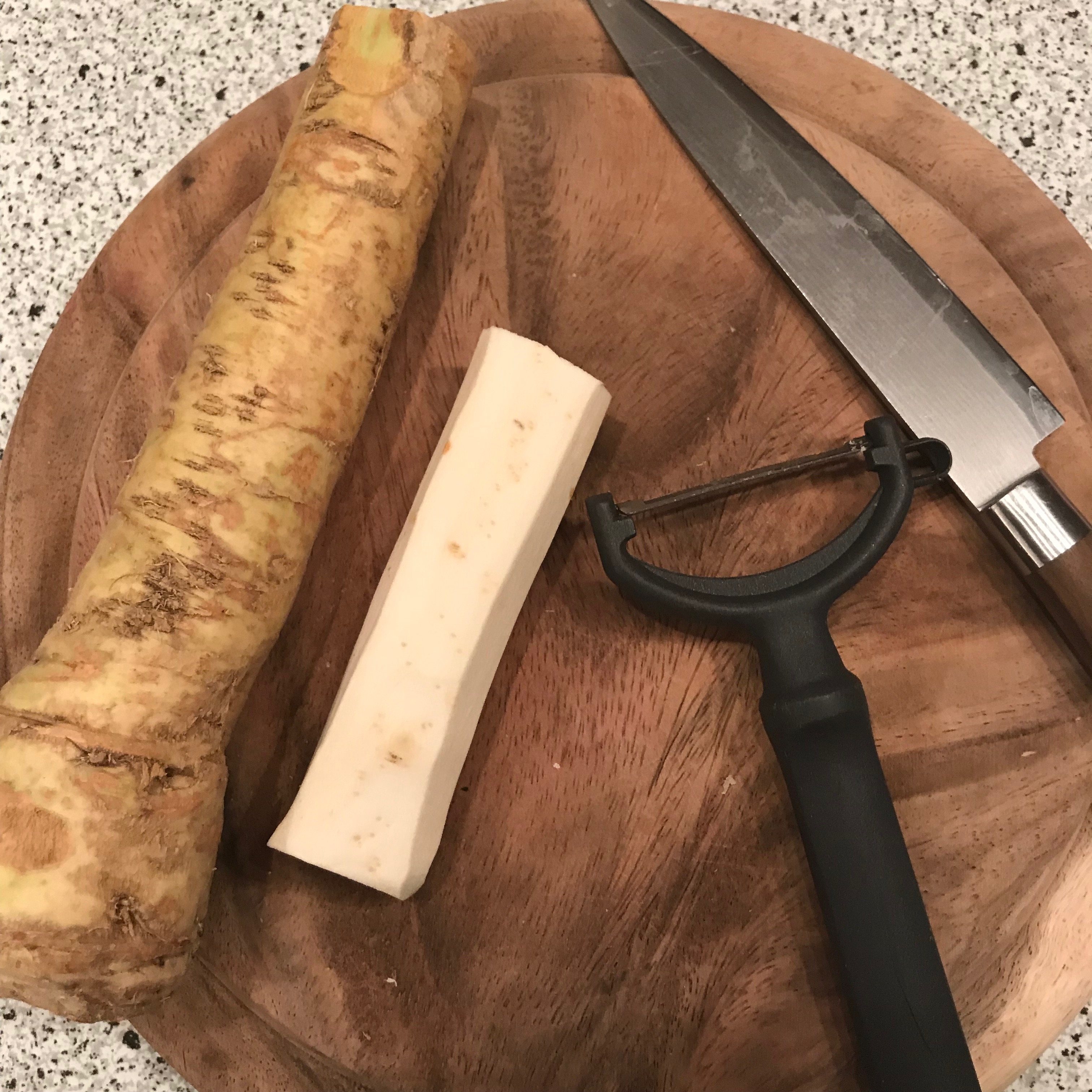 15 – 20 cm langes Stück Meerrettich schälen und fein raspeln.