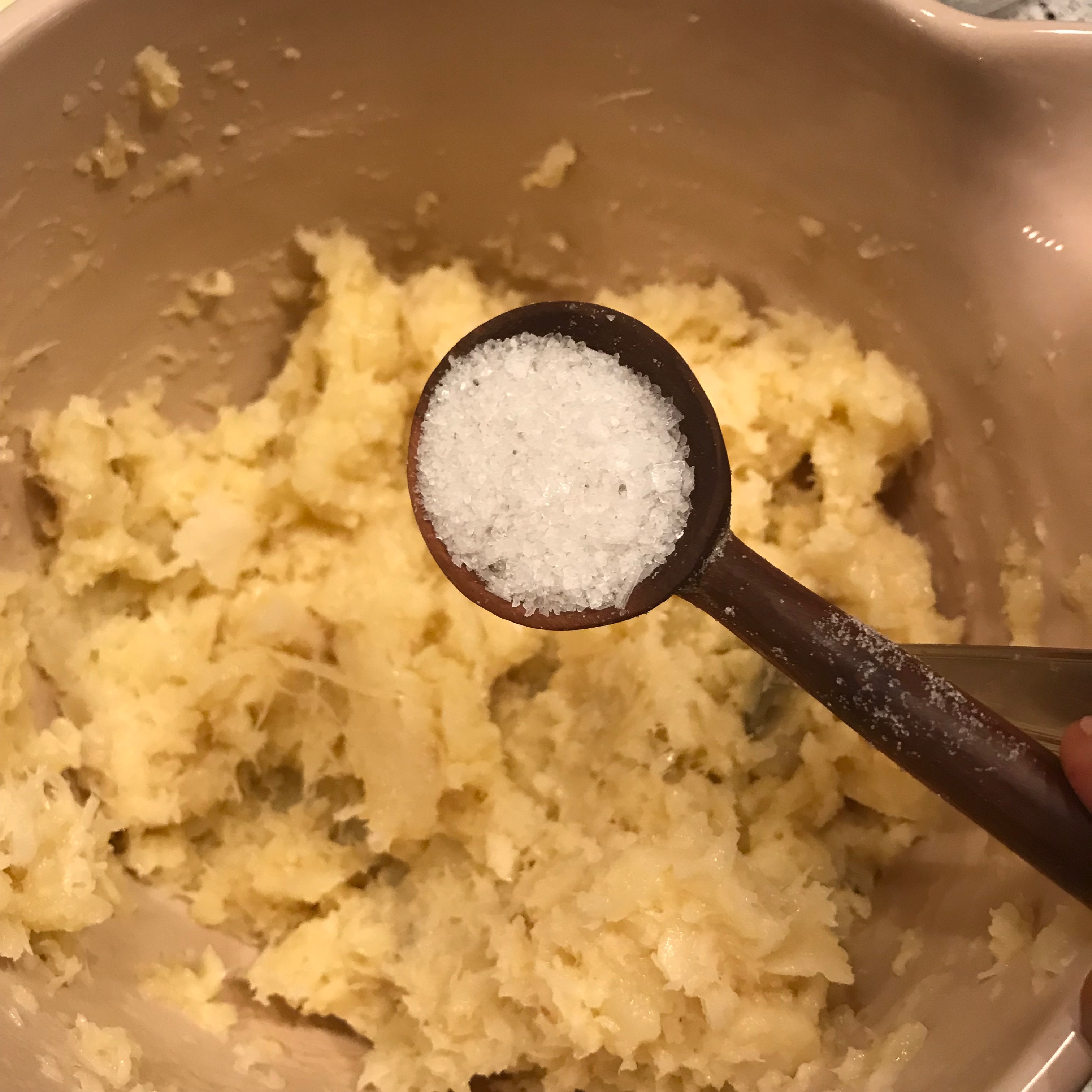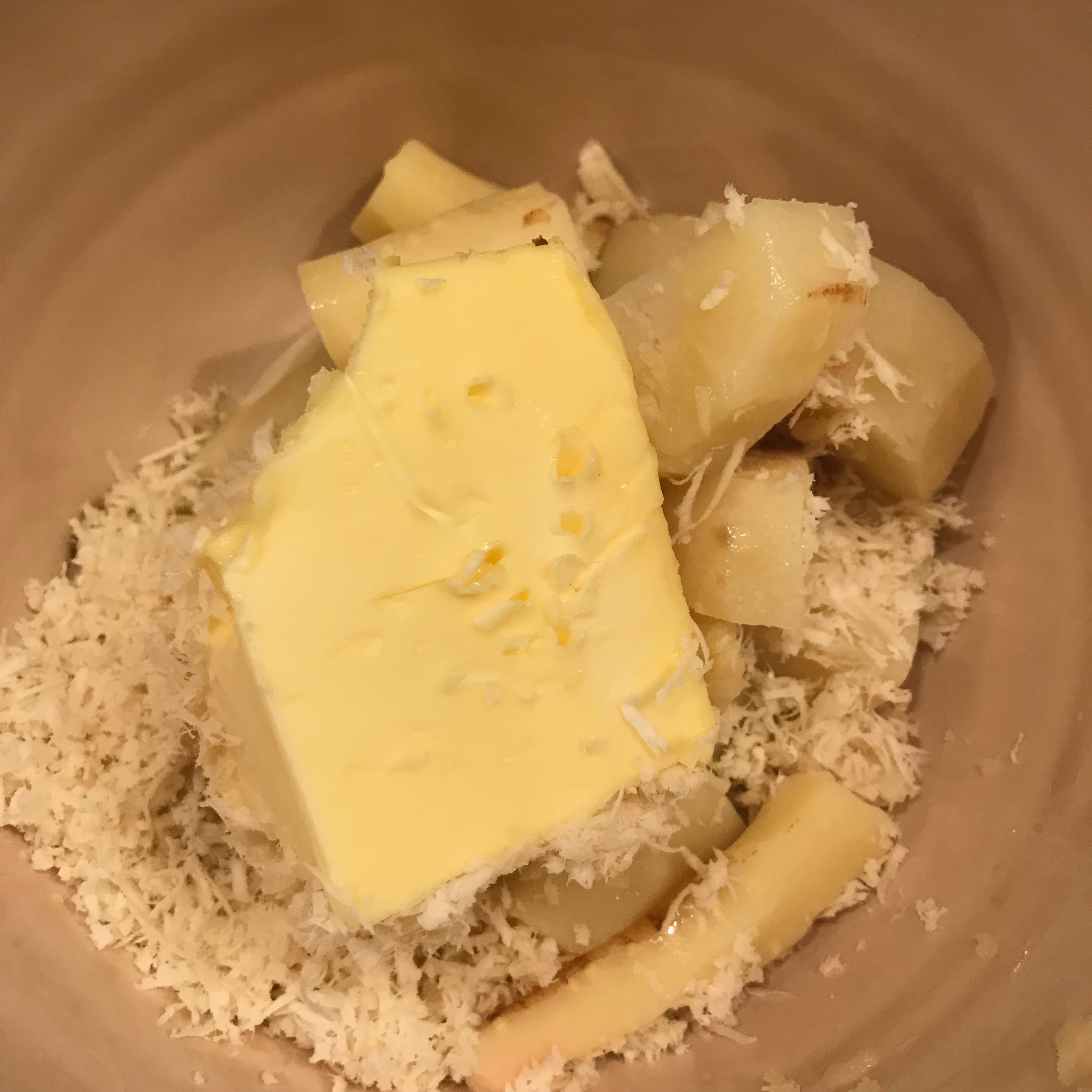Weich gekochte Pastinake und frisch geraspelter Meerrettich mit einem großen Stück Butter vermengen.