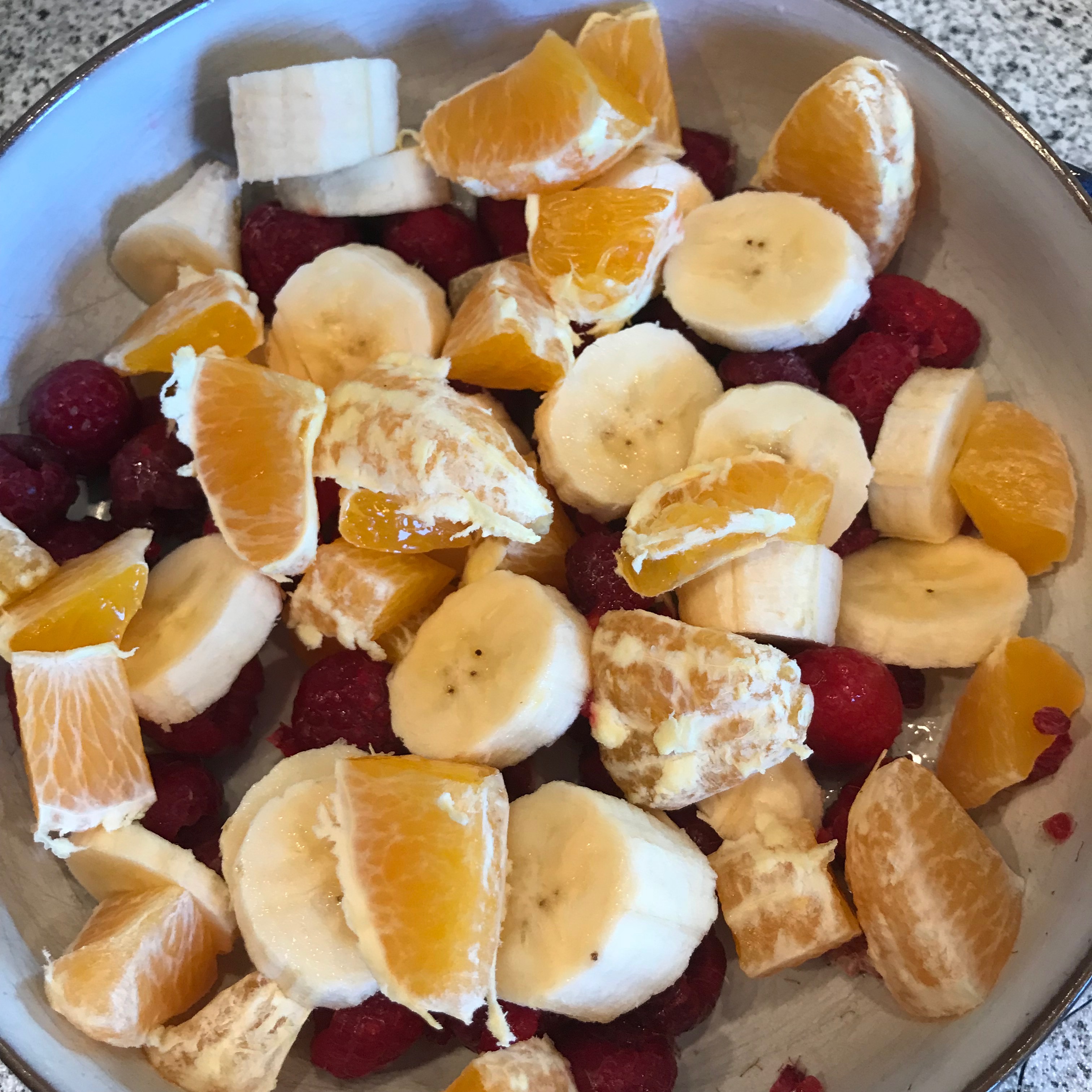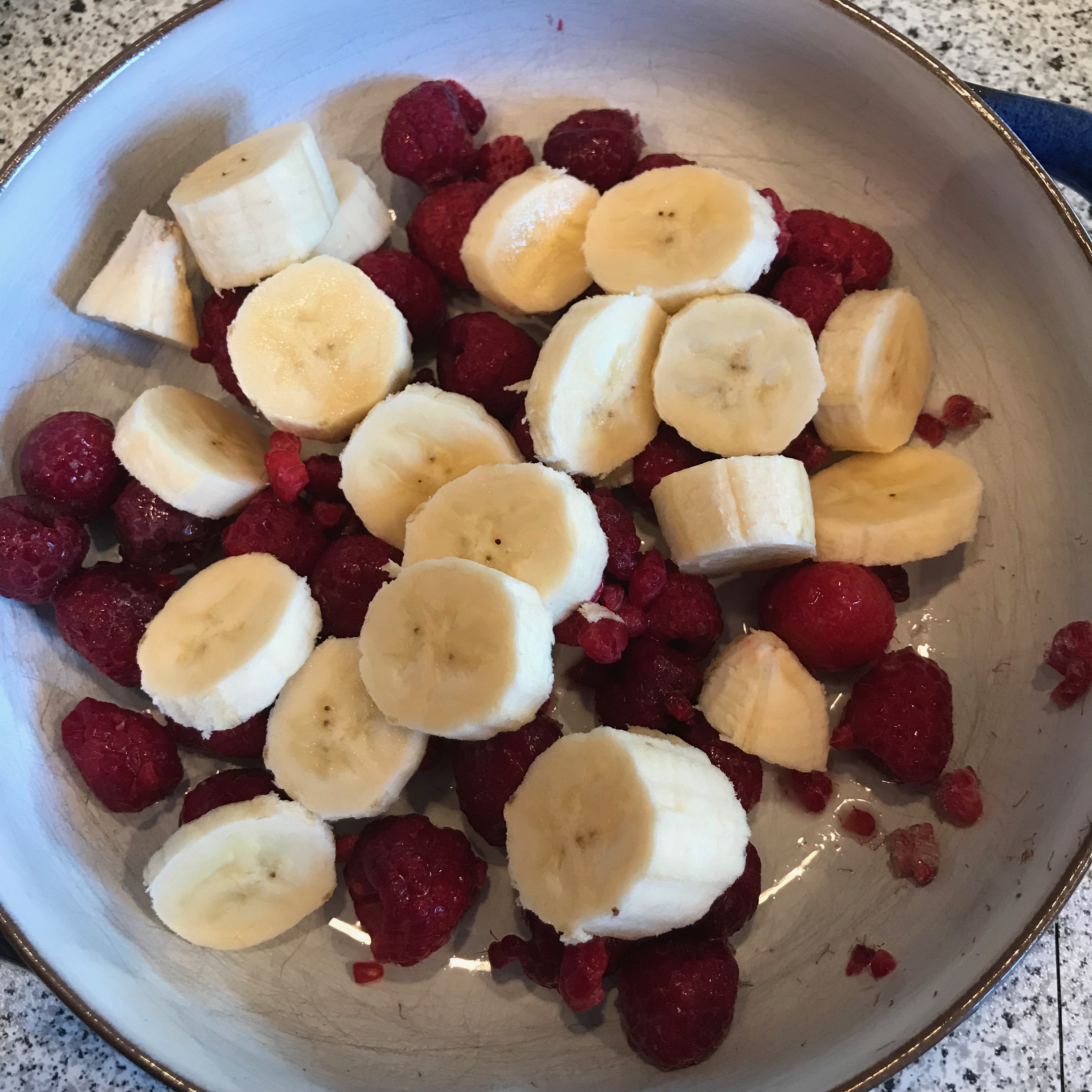 Cut the frozen raspberries, banana, orange and apple into bite-sized pieces.
