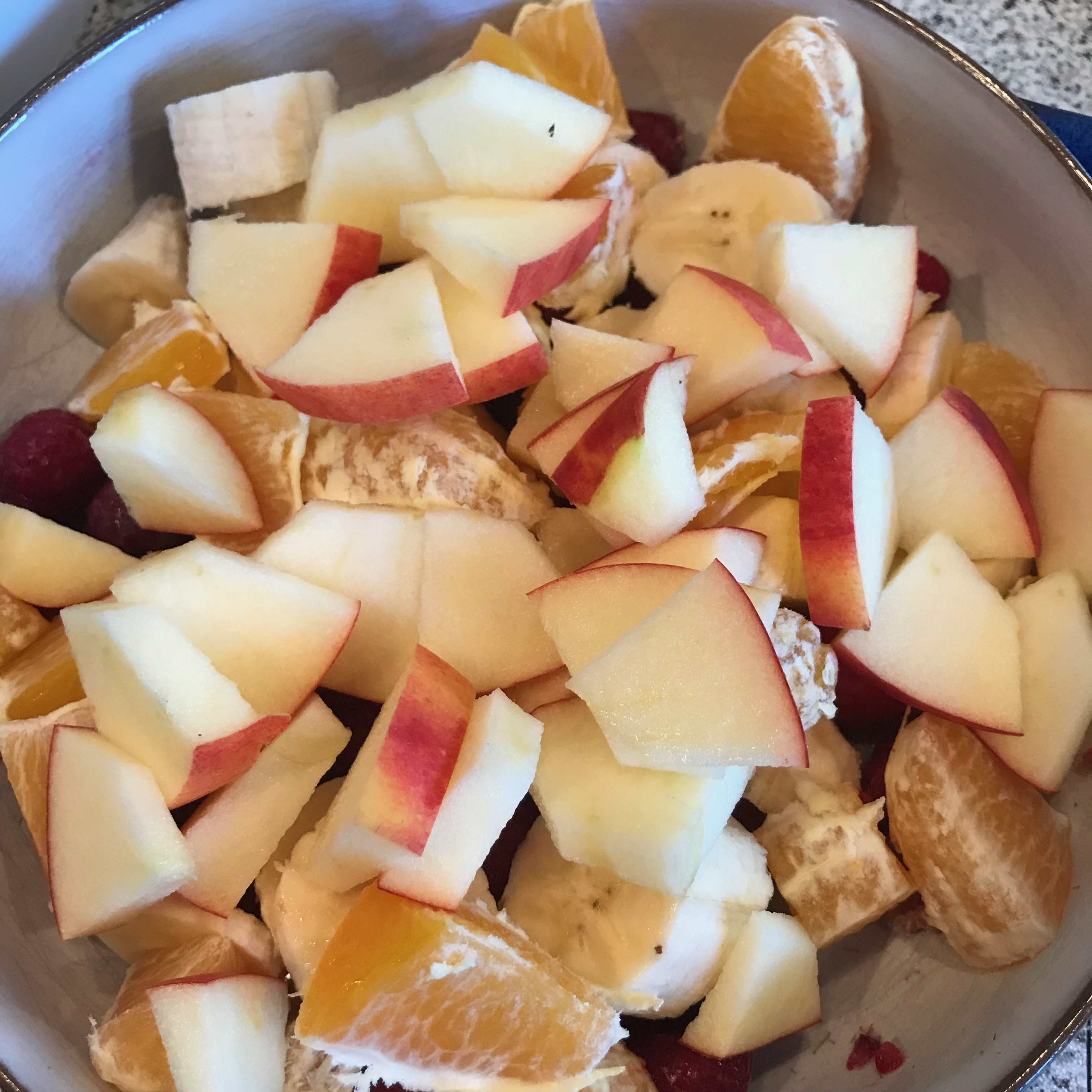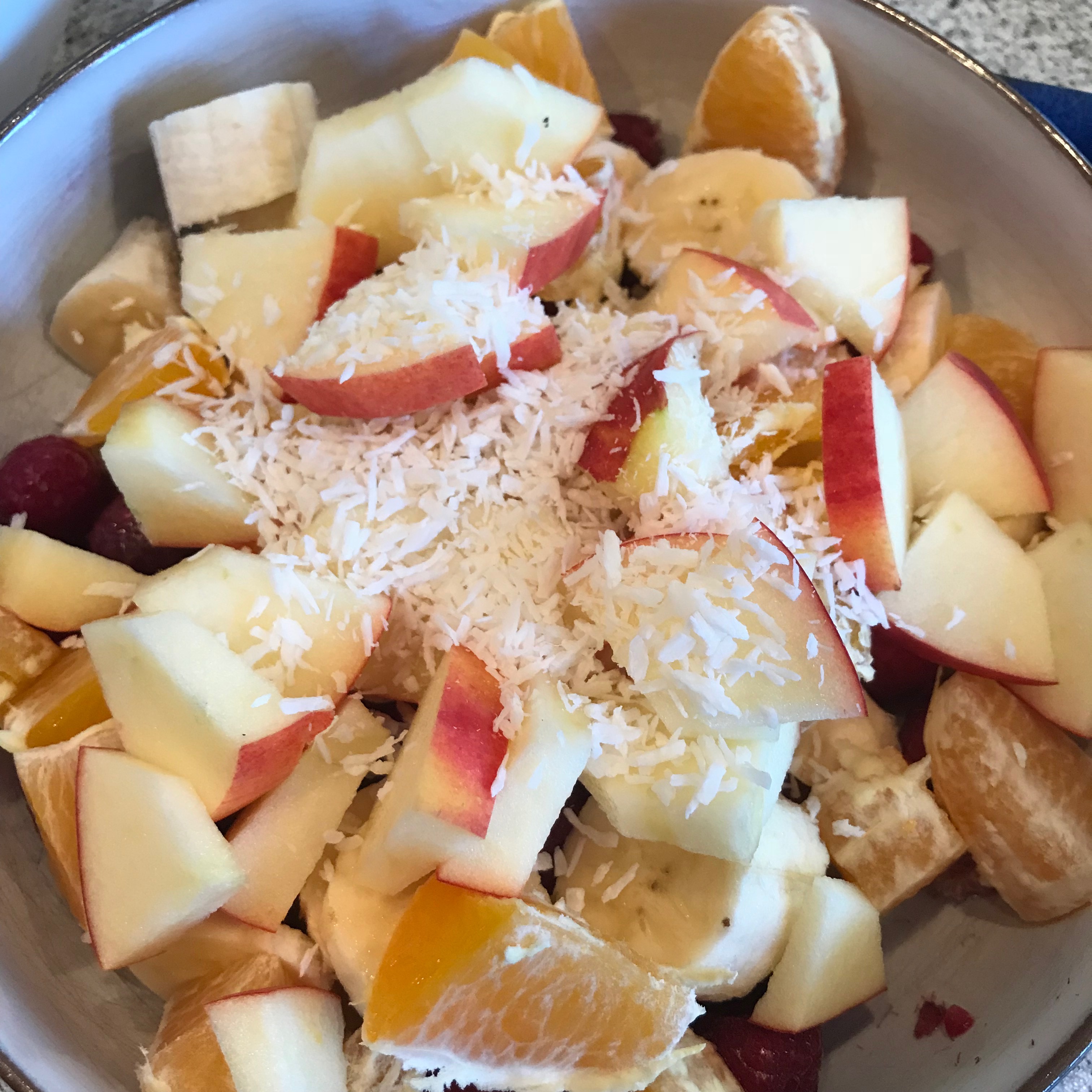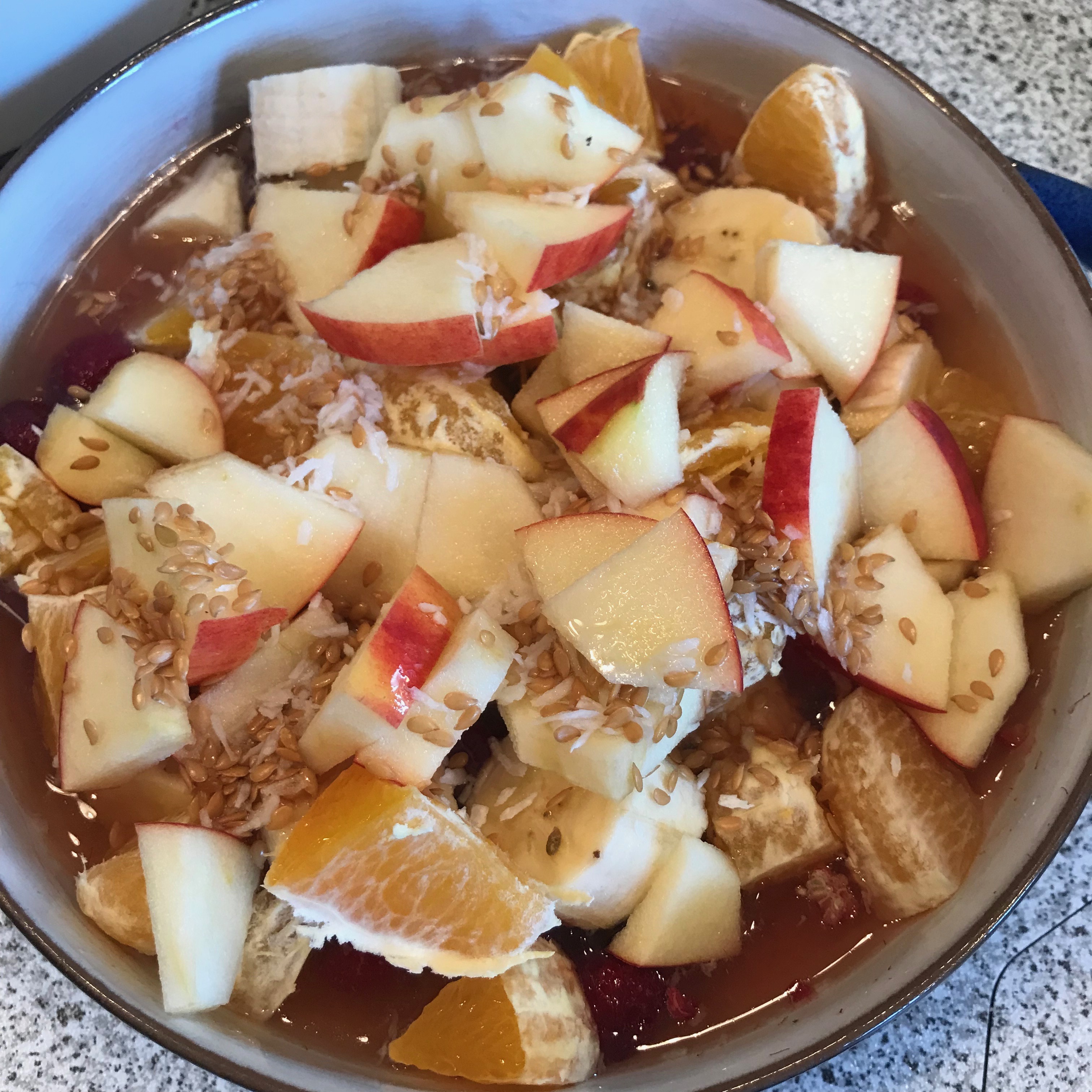 Sprinkle with grated coconut and linseed. Adding hot apple juice makes the fruit salad easier to digest for me.