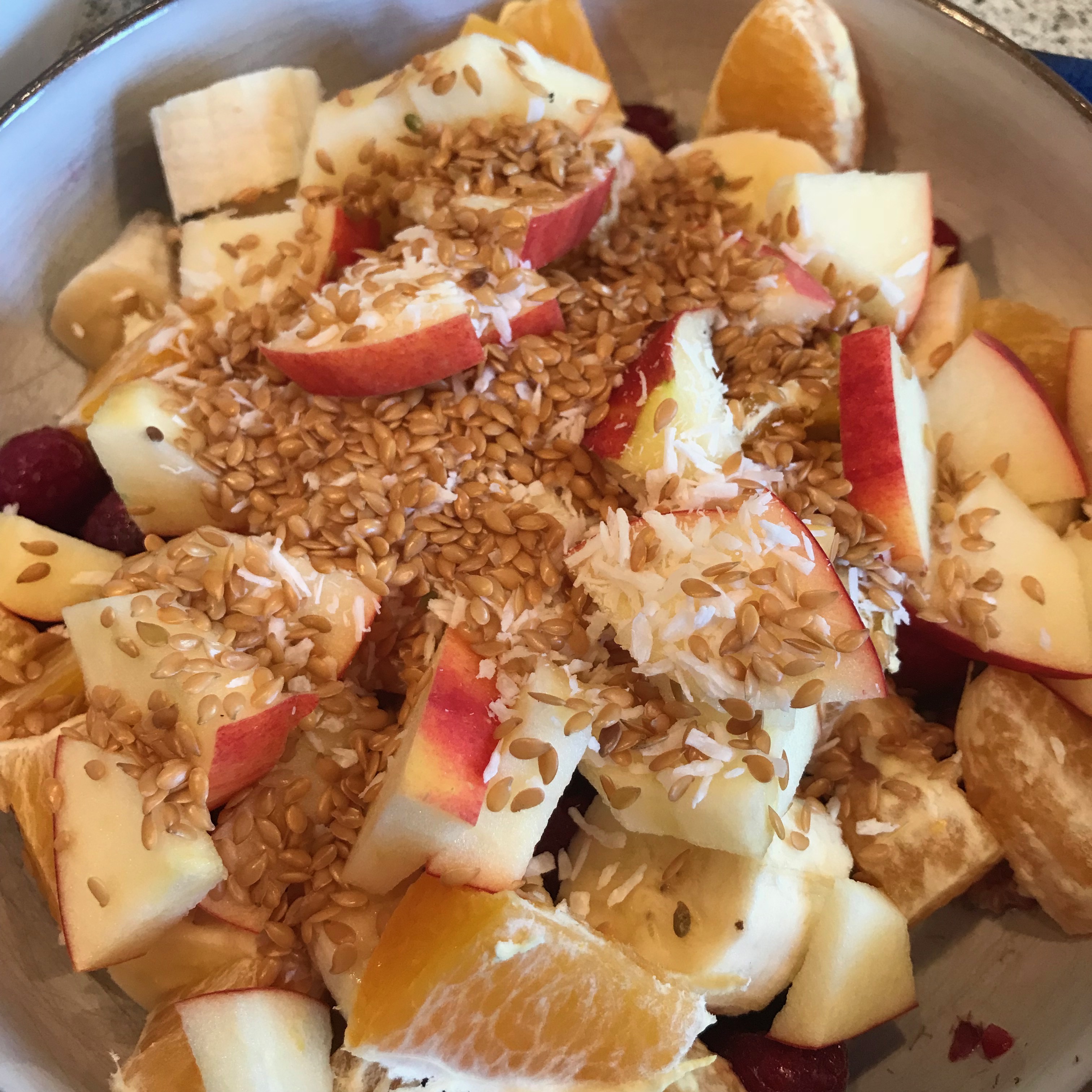 Kokos-Raspel und Leinsamen drüber streuen. Heißen Apfelsaft dazu geben, macht den Obstsalat für mich besser verdaulich.