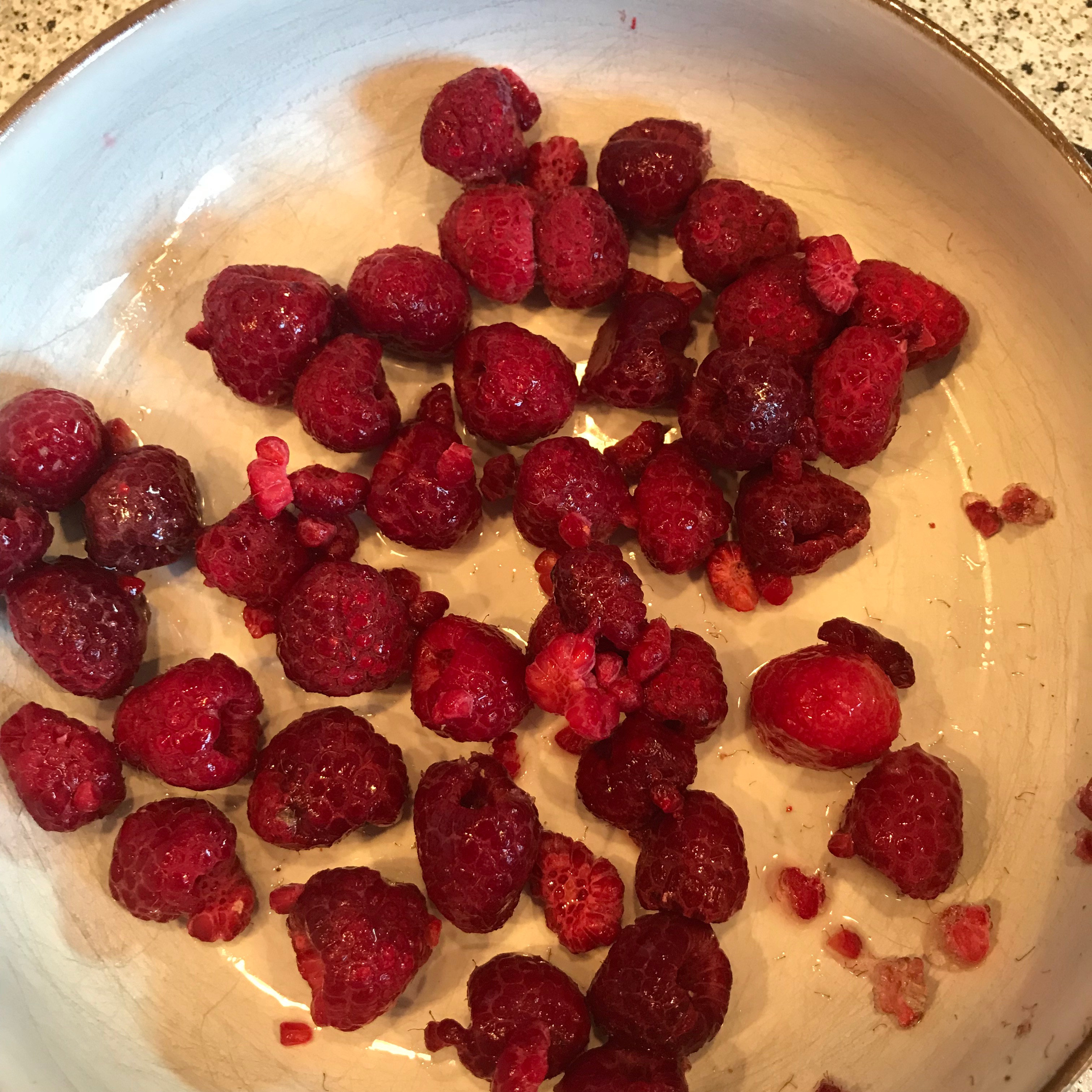 TK-Himbeeren, Banane, Orange, Apfel in mundgerechte Stücke schneiden.