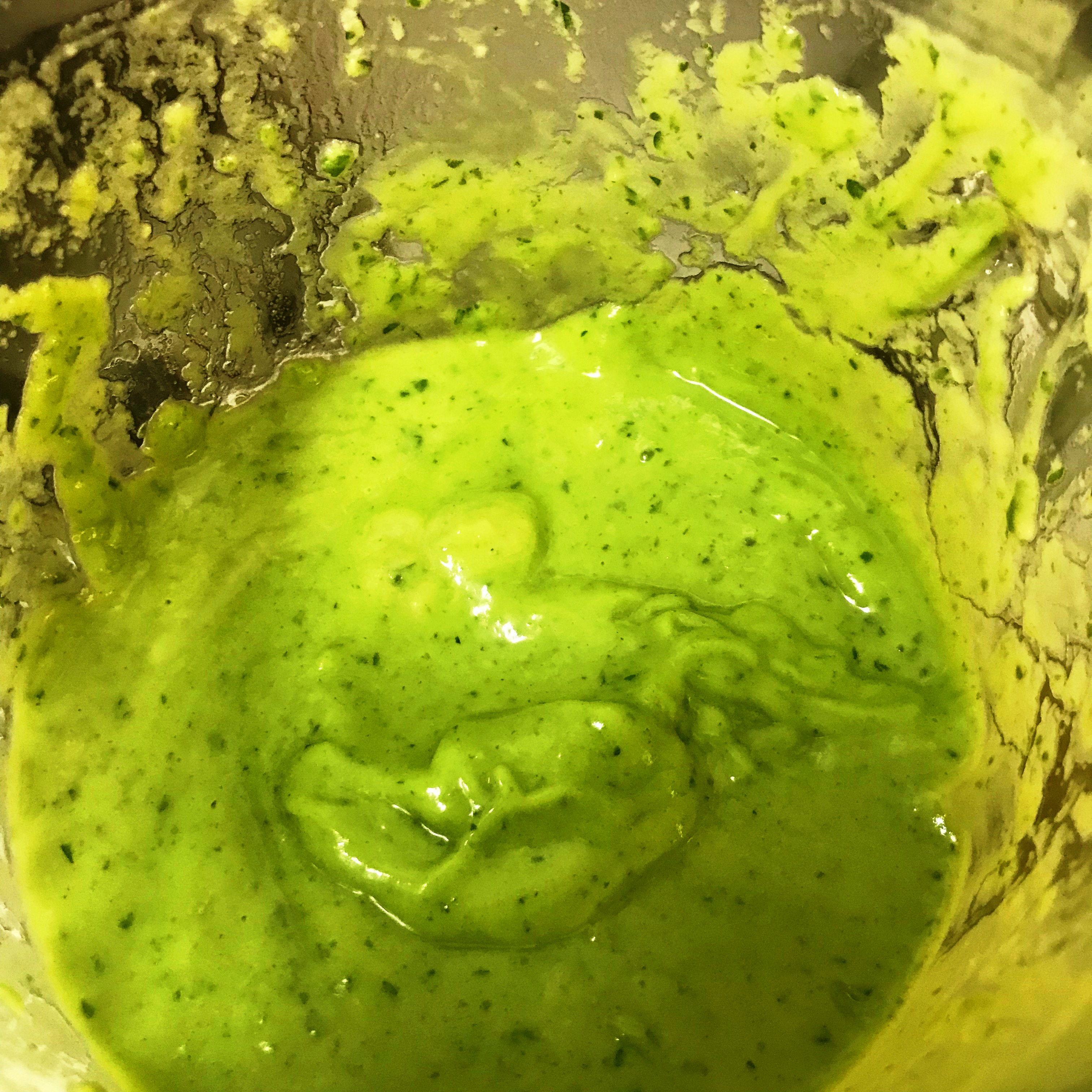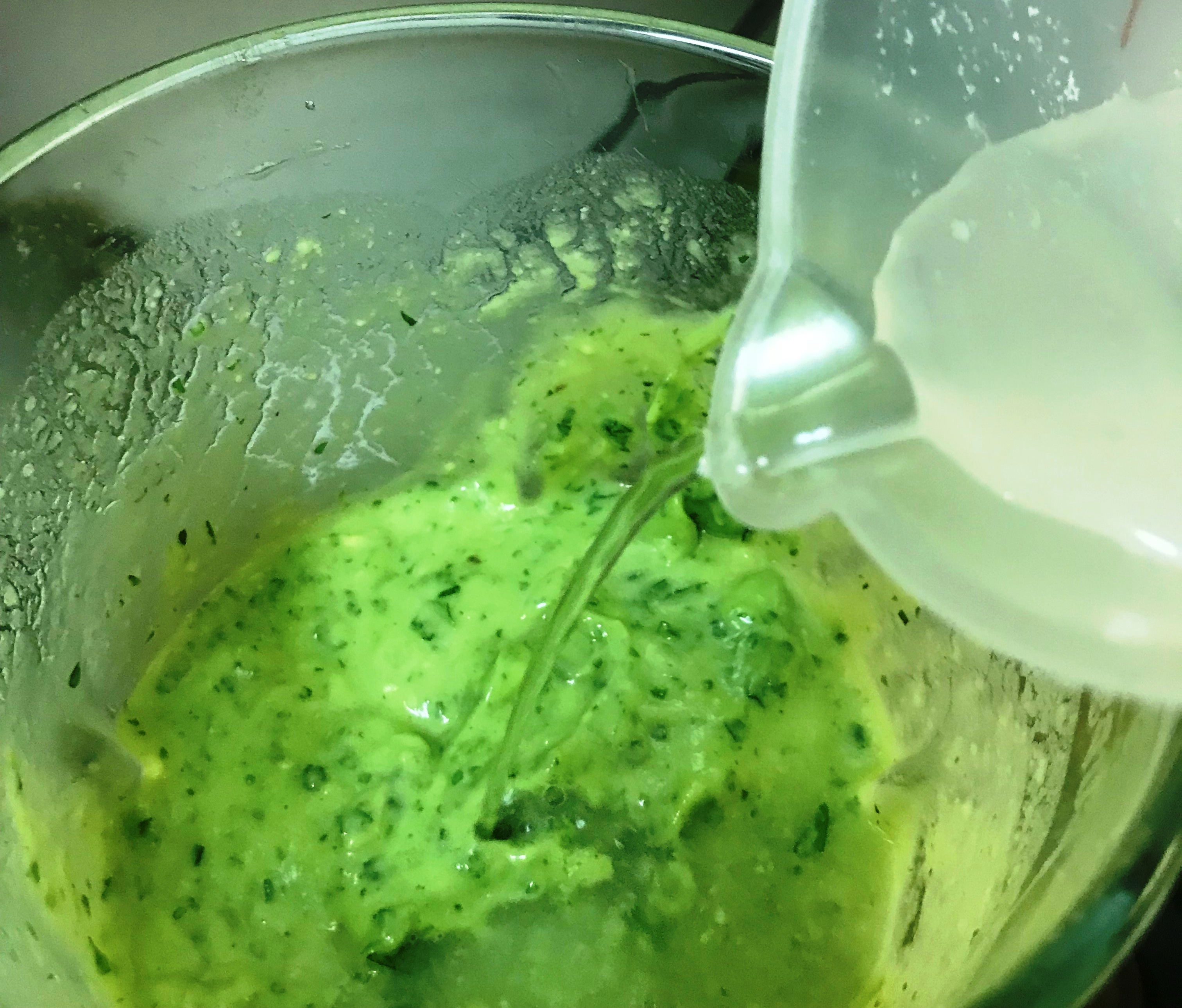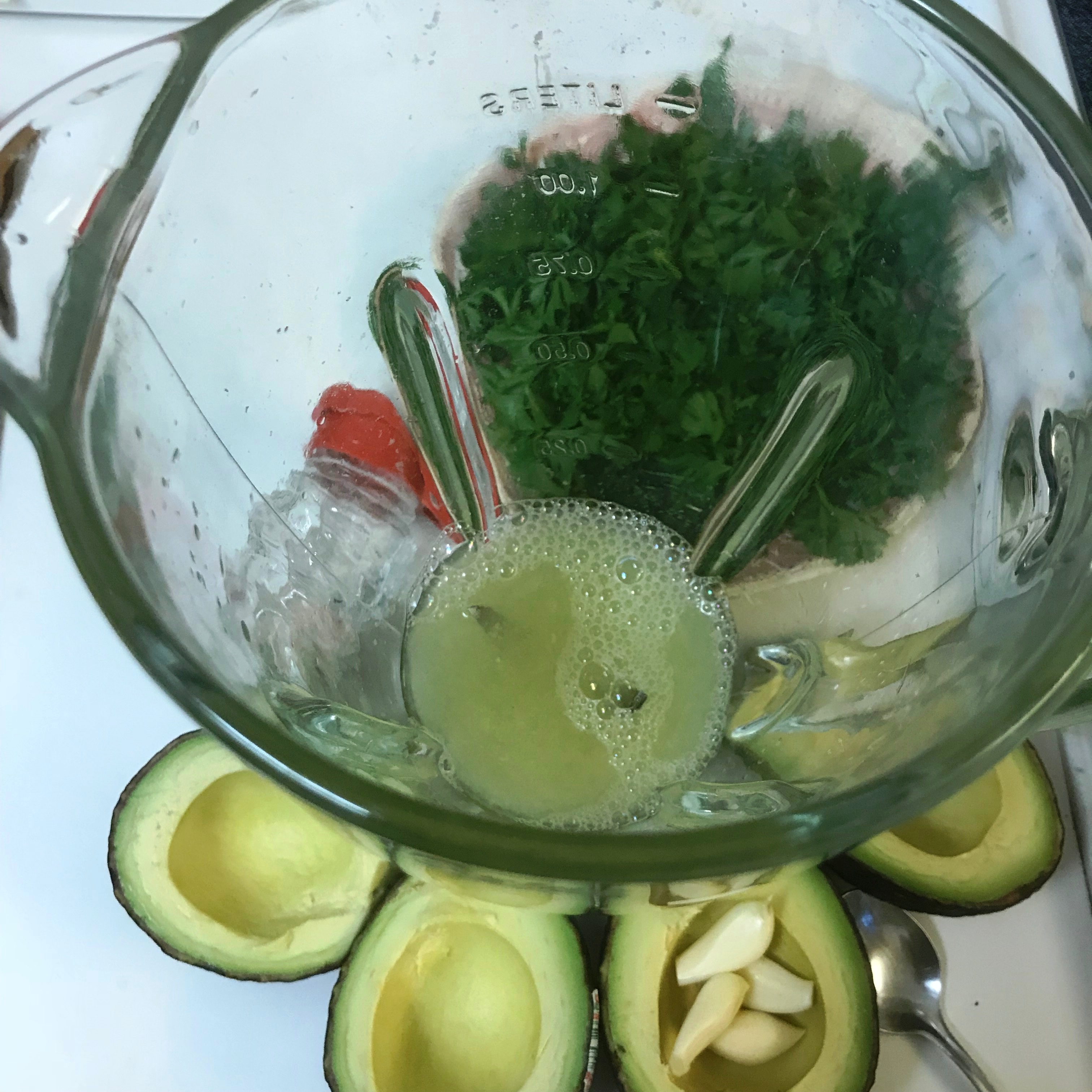 The ingredients are 2 avocados, the juice of 2 lemons, a bunch of parsley, 4 cloves of garlic, salt and agave sirup.