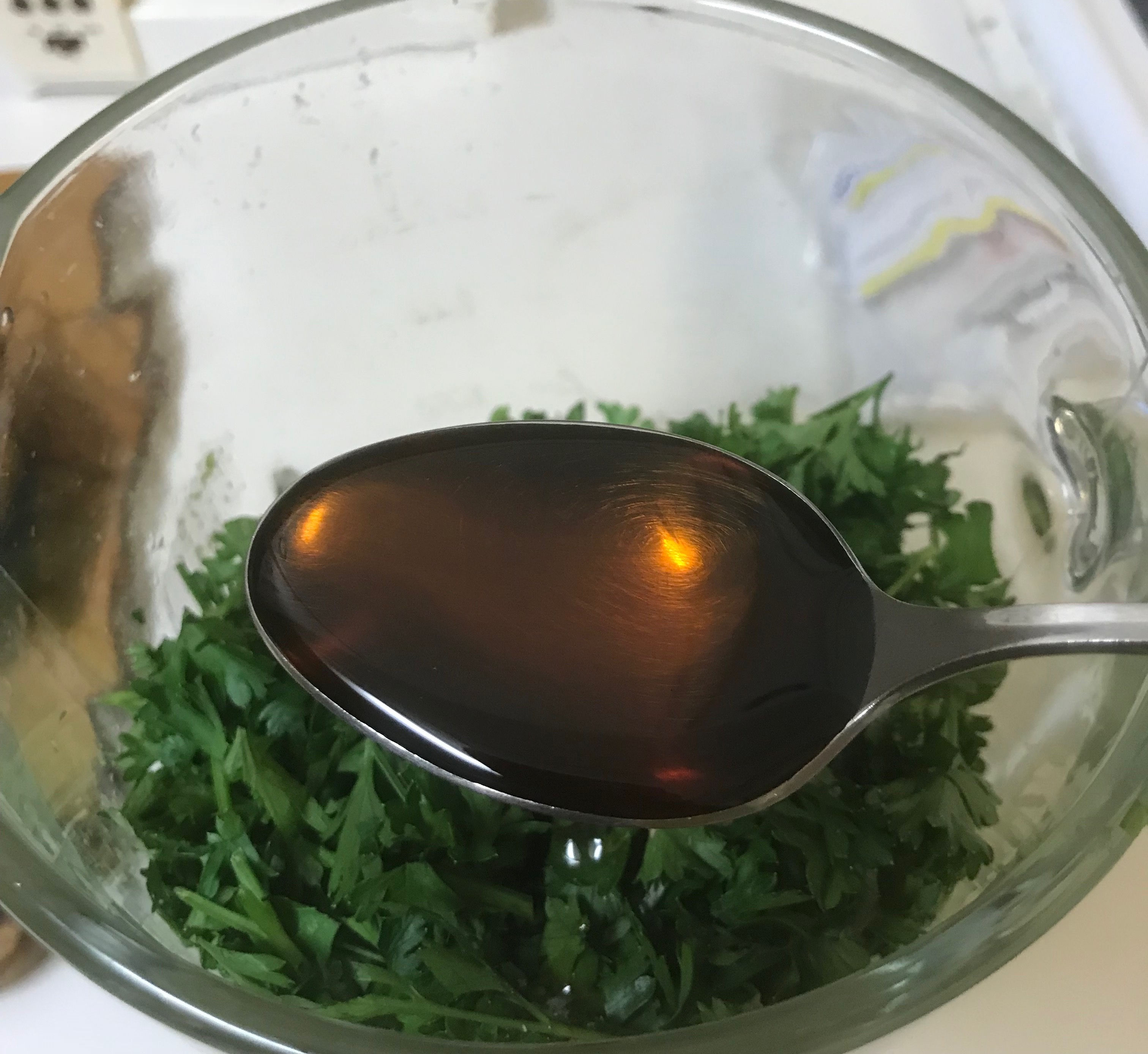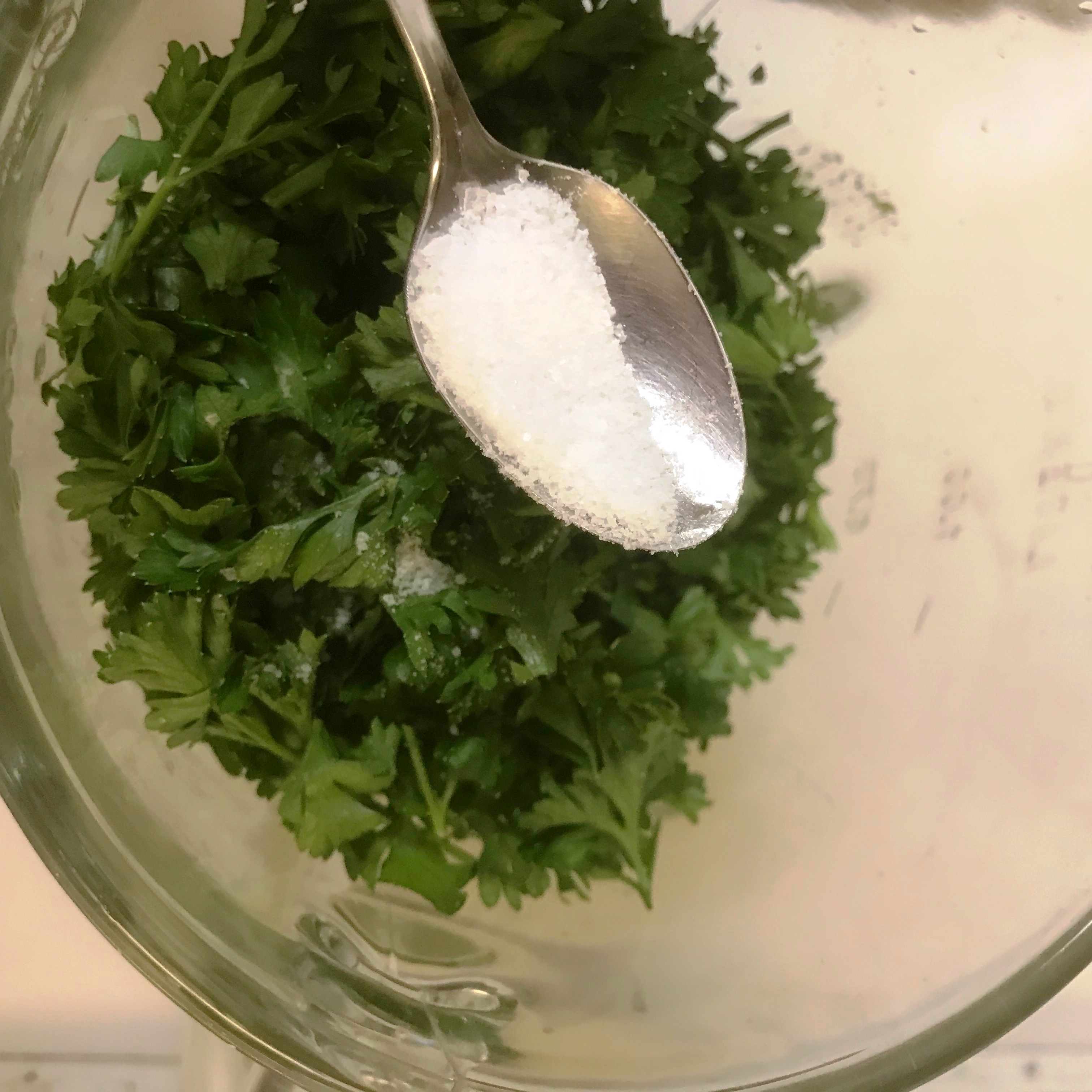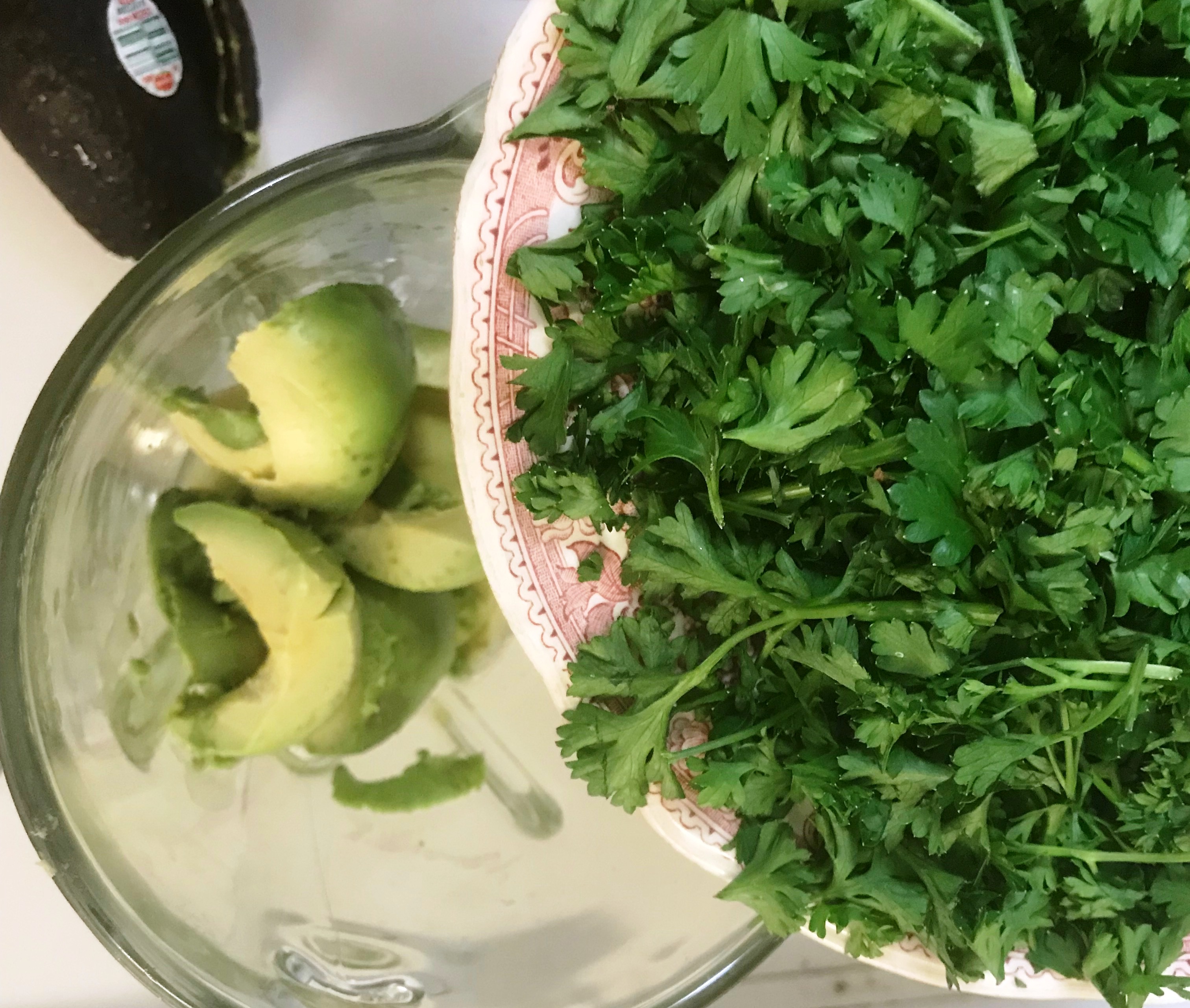 Die Zutaten sind 2 Avocados, den Saft von 2 Zitronen, ein Bund Petersilie, 4 Knoblauchzehen, Salz und etwas Agaven-Sirup.